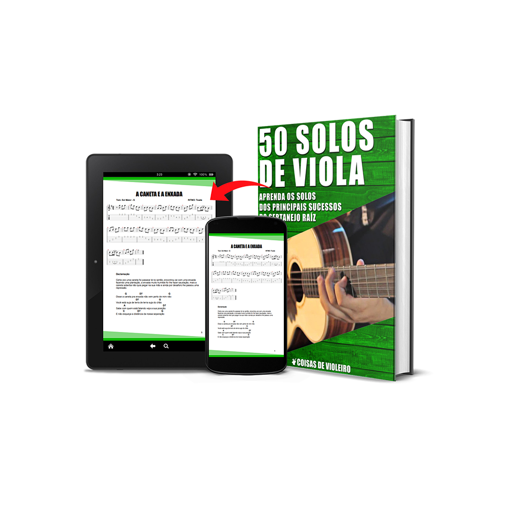 O material não se limita a apenas um formato. Você encontrará a tablatura para localização rápida no braço da viola, a partitura para a leitura rítmica e melódica exata, e as cifras para o acompanhamento harmônico